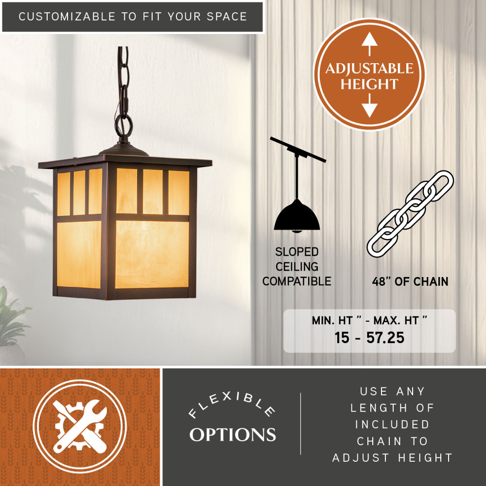 Flat strips of burnished bronze outline honey opal glass panes in the Mission collection. The simple design of this fixture has a mission style look perfect for Frank Lloyd Wright prairie inspired decors. This outdoor pendant is ideal for your porch, entryway, or any other area of your home.