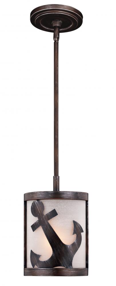 Bring your love of the sea indoors with the Nautique collection. The nautical inspired coastal of ships wheel and anchor emblems are sure to be the buzz of any social gathering. It features a sterling bronze finish with white frosted seeded glass in a drum shape. Install this mini pendant individually or in a group; ideal for kitchens, dining areas, or bar areas. Height is adjustable with the included down rods.