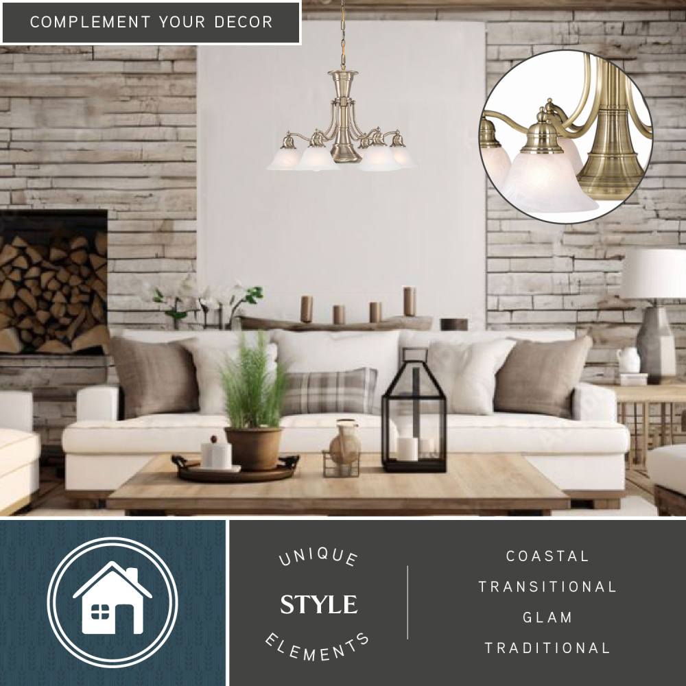 A simple yet sophisticated design is fitting in the traditionally styled Standford collection. It features an antique brass finish with white alabaster glass shades. Create a distinguished yet classic look by combining pieces from this extensive series of fixtures. The central column contains an additional bulb controlled separately by an integrated 3-way switch allowing for task down lighting when you need it. This chandelier is ideal for kitchens, dining areas, and foyers.