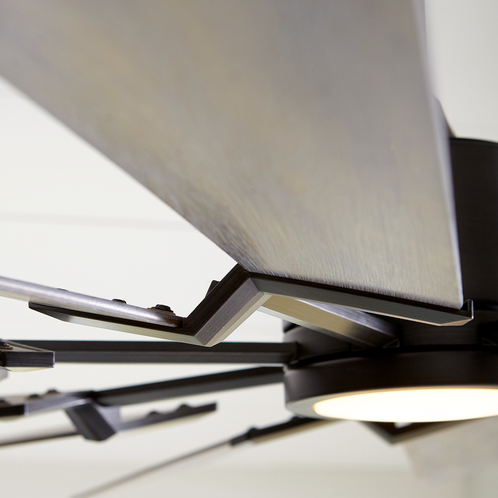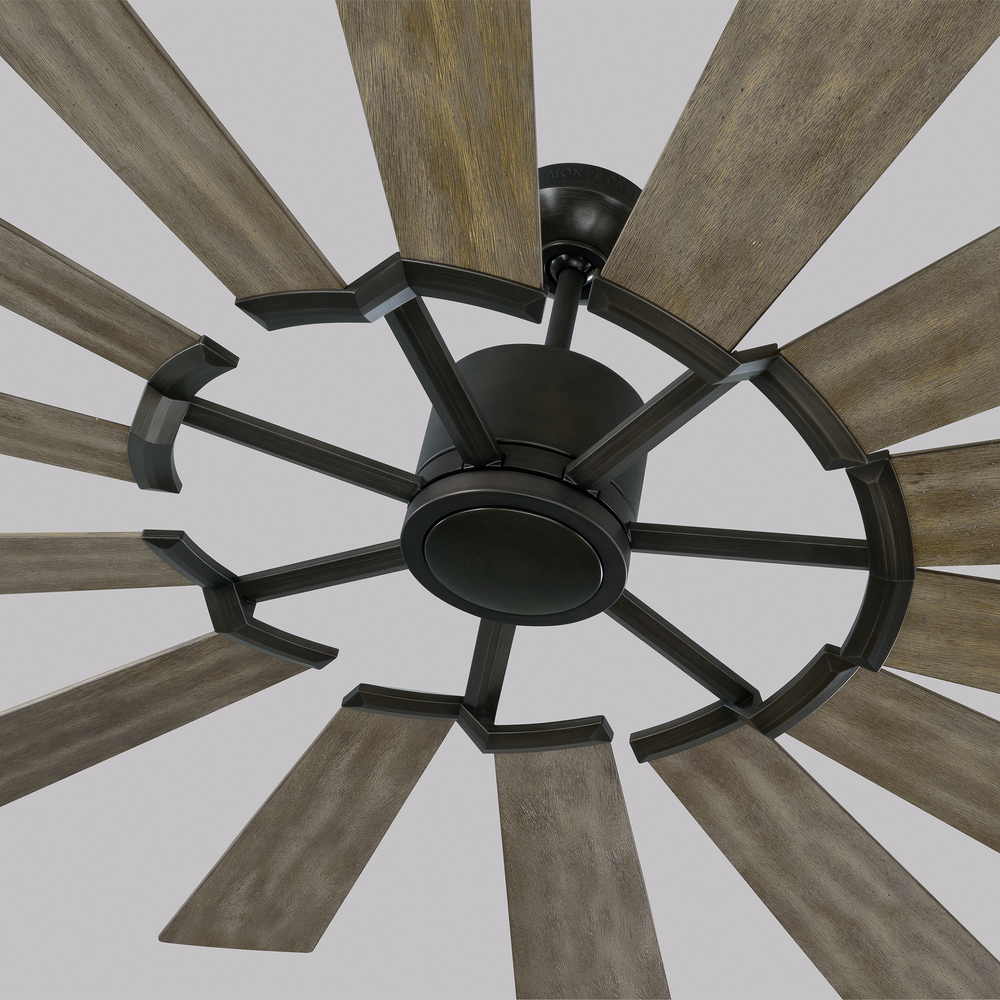 The Prairie 72 LED in Aged Pewter features a 125.0 X 25.0 6-speed motor with a Fourteen-degree blade pitch. A stunning windmill-inspired aesthetic with 14 blades and a stately 72" blade sweep makes the Prairie Grand ceiling fan bold and beautiful design. Two distinct finish options are Aged Pewter with Light Grey Weathered Oak blades and Brushed Steel with Washed Grey/Silver reversible blades. An integrated 15W LED downlight with 740 net lumens is covered with a frosted Lexan shade. An included 6-speed remote control adds to the functionality of this fan. All Prairie Grand fans come with a finishing cap without a light kit.